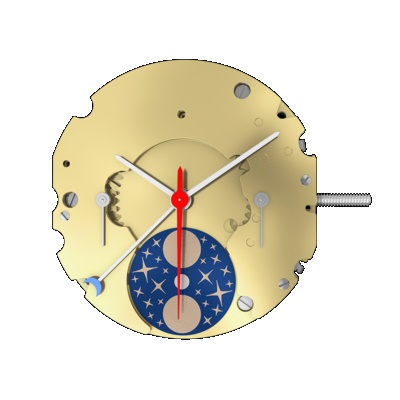 Funktion: 2 Zeiger und Zentralsekunde, Woche, Kalender (3) und Tag (9) mittels Zeiger, Mondphase